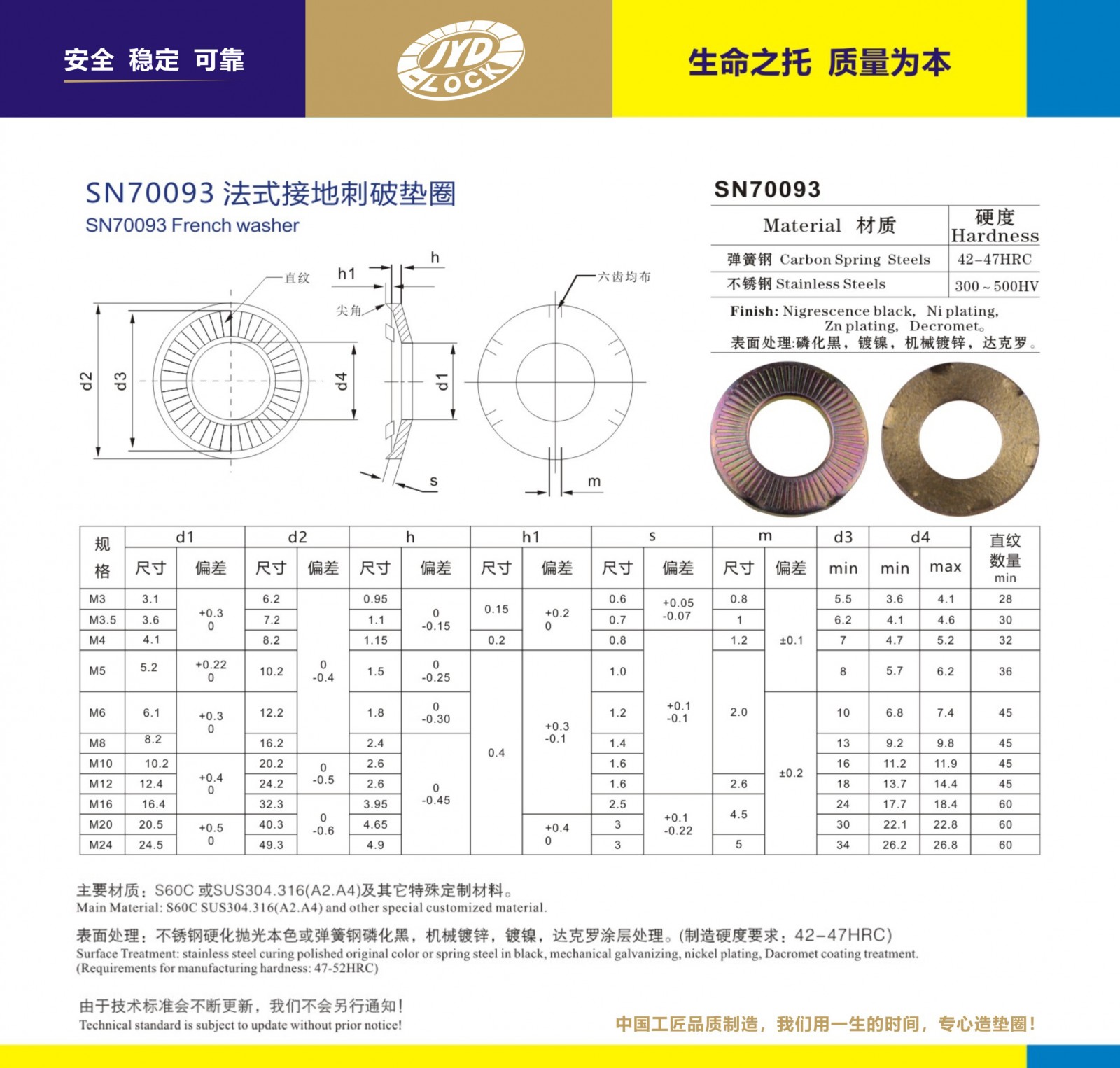 SN70093是德国西门子公司的企业标准、该垫圈是一款法式锁紧垫圈的改良设计产品、表面条纹有预紧防松作用。垫圈的背面设计有六个爪形剌破角!主要功能是在配合螺栓螺钉拧紧时可以剌破金属基体表面!主要功能是剌破作用、因此也有人叫剌破垫圈、带爪触地垫圈!